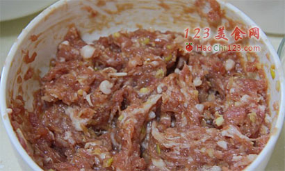 1、将葱姜改刀放入肉馅中,生抽,淀粉,盐,1勺糖,然后顺着一个方向快速搅匀,使肉上劲。