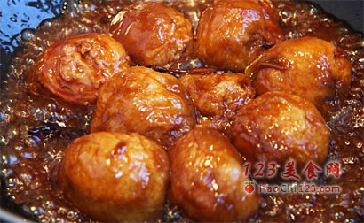 6、煮开后放入黄酒,冰糖,老抽盖上盖子转小火煮20分钟左右即可(放入冰糖还会使整道菜的颜色变的很亮,看下面的图就看的出来)。