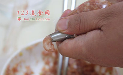 3、将肉馅装入裱花带中,前面装上裱花嘴(这个灵感源于泡芙,但又不能用专门做泡芙的嘴,因为那个太细,肉馅挤不出来,PS图片里的手是俺老公的哦)。