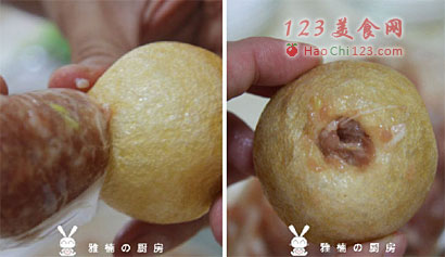 4、再把肉馅对准面筋球的孔一挤,肉馅就全部装入了,非常方便。