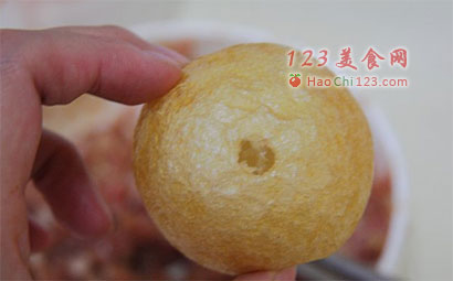 2、筷子顶端蘸少许水,在面筋球的表面扎一个孔,然后伸进去,转着圈的把面筋球里面的面筋搅碎(这样才能放进更多的肉馅)。