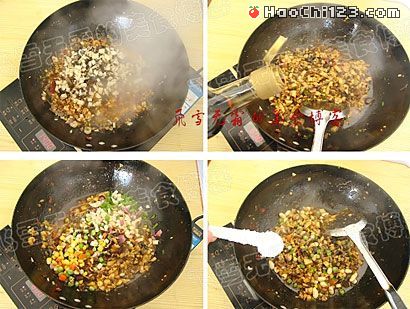12、倒入各种肉丁及虾仁。