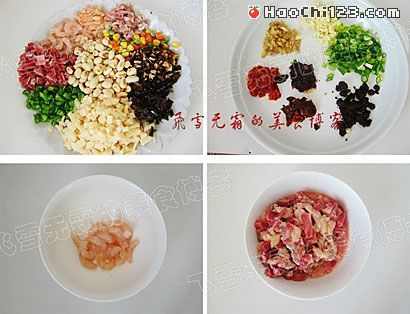 鸭胗一个80克、鸡脯肉30克、猪肉30克、虾仁60克、熟花生米60克、泡好的木耳30克、泡好的香菇30克、青椒30克、笋120克、玉米粒、胡萝卜粒、豌豆粒总共50克。