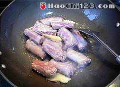 2、炒锅中倒入油,大火加热至8成热,倒入姜片和鸭颈翻炒至变色后,倒入照烧酱,翻炒片刻。