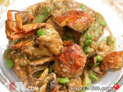 2、坐锅点火倒入油,待油热后将蟹块沾上面糊入锅炸成金黄色,取出,锅中留底油,下葱、姜、蒜末、丝瓜煸炒,再放入河蟹,烹入料酒、醋、酱油、白糖、鸡精调味,加少许清水;