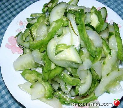 1、将苦瓜去瓜蒂,剖开成两半,去瓤,斜切成片,然后下沸水中焯至断生,捞出控净水分,放入盘内,趁热撒入适量精盐拌匀,控干水分待用。