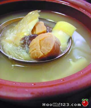 2、将以上用料(除猪肝外)放入砂锅,加葱、姜、酒(20克)和清汤(1250克)、用温火烧至七成熟(约三小时)后,即加油豆腐,继续烧至全熟,放入猪肝,并将香糟加酒和清汤淘和过滤后倒入一滚,取去葱,姜即好。
