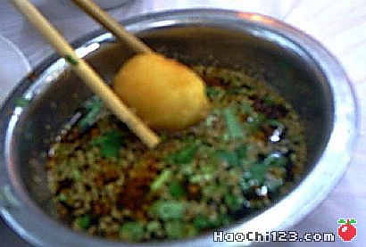 (2)洋芋去皮、切片蒸熟,压成泥状,将炒过的馅倒入拌匀, 再加入少许太****和成团状。