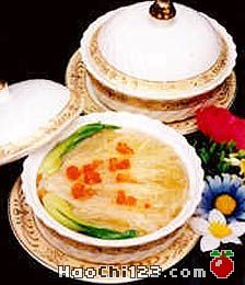 1、将鱼翅整只扣在碗里,加上酒、葱、姜蒸约一小时,倒掉汤,取出翅,放入开水锅里川一下(要注意不要将翅弄散),再用冷水洗净。