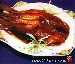 2.炒锅置旺火烧热,放入熟猪油,投入葱段煸黄出香后捞出,放入鱼尾煎至两面发黄,烹入绍酒稍焖,再加入姜末、酱油、白糖及清水,盖上锅盖,烧沸后移小火焖8分钟,再转旺火收稠卤汁,淋入芝麻油,起锅将鱼尾整齐地装入盘中即成。