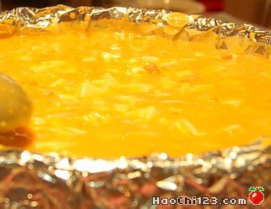 2、然后放在内脂豆腐上,上锅蒸10分钟后起锅撒上鲜蟹柳粒即可。