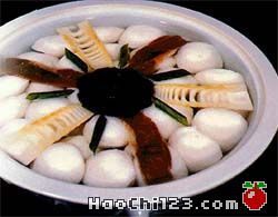 4、熟笋片、水发香菇沸水略氽,熟火腿片、笋片在鱼丸上面间隔摆放,香菇结顶,四围豆苗衬托,淋上鸡油即可。
