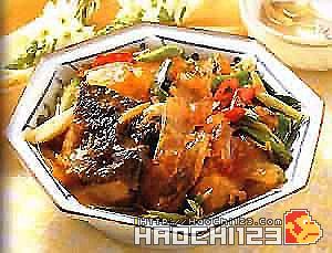 1、鲢鱼头洗净,拭干,用调味料(1)腌10分钟,再用4大匙油将鱼头两面煎黄盛出;