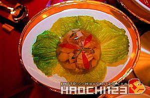 鳕鱼切丁,干贝加黄酒涨成拍成丝,锅置灶上放入水烧沸加入鳕鱼烧熟,沥干水分后放在盛器内。锅内加入用肉皮做成的皮冻,加味精、盐再放入干贝丝,静放在冰箱内结冻后切片装盆即可。