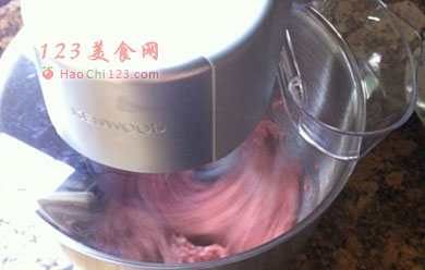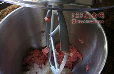 2、将肉糜,山药,生姜末,蛋清,少许盐,料酒,依次加入厨师机料桶;以k型头2档连续搅打5分钟,期间分次往加料口加少许高汤或清水。