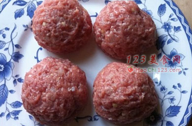 3、将搅打好的肉馅揉成大肉丸子(六个)并捏紧实。