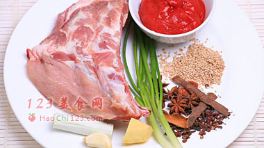 葱姜蒜各5克、香葱3克、八角6克、花椒4克、桂皮3克、番茄酱20克、熟芝麻3克、白醋5克、绍酒8克、盐3克、白糖5克。