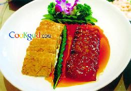 自制油皮肉夹200克,带皮五花肉500克。调料色拉油800克,香油3克,精盐5克,黄瓜片10克,硝0.5克,鸡汤2千克,鲍鱼酱100克,高汤2千克,干脆炸粉50克,八角6颗,花椒12克,丁香2克,老姜50克,大葱100克。