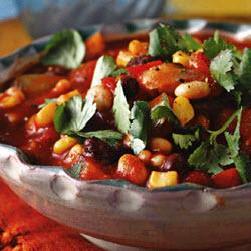 蔬菜油2汤匙,大洋葱1个,切碎,红甜椒1个,去籽后切块,小胡萝卜1根,削皮后切丁,细芹菜茎1根,切丁,大蒜4瓣,切末,辣椒粉3汤匙,匈牙利甜辣椒粉(paprika)2汤匙,干奥勒冈(oregano)2茶匙,压碎,小茴香粉(groundcumin)1茶匙,整粒西红柿1罐(约790克,切块,留下西红柿汁),白腰豆(cannellinibean)2罐(每罐约540克),沥干后用水冲洗,黑豆(blackbean)1罐(425克),沥干后用水冲洗,低钠酱油60毫升,玉米(粟米)粒1盒(约280克)