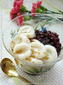 4.捞起加入糖桂花和蜜红豆.放冰箱冷藏后再吃那可是消暑佳品.不想吃饭时咱就吃这个.