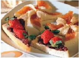 2.取一片三角形土司,铺上1/4份量的红豆泥,再放上2颗草莓即可。