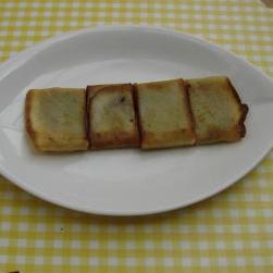 4.将饼两侧向中间折合,使成三层饼。再切成4个相同大小的块。