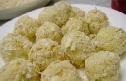 4.把炒锅端到火口上,将豆沙球外面挂的糊炸至外面酥软,随即捞在盘内,撒上白糖即成。