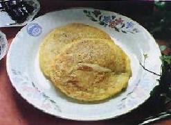 5、在烧热的煎饼锅里抹上猪油后,捞一大勺煎饼浆放入煎饼锅里,摊成圆扁的形状,中间放一个猪肉片,然后前后煎成金黄色即可。