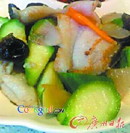 取丝瓜与多宝鱼共烹是一种典型的清淡吃法,两种食材配搭在口感上比较简单,可选择墨鱼薄片(又名花枝片)共烹,增添其风味。这种菜式讲究姜、蒜带来的香气和打芡时汇集成的清而不淡的口味。多宝鱼柳、花枝片都富含海鲜具有的蛋白质,与B族维生素含量丰富的丝瓜配搭,营养合理,食味相宜。