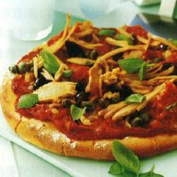 橄榄油2茶匙,洋葱1个,剁碎,切丁西红柿1罐(400克),干牛至1/2茶匙,糖少许,现成的比萨饼皮(每个约240克)2个,切碎的西红柿2汤匙,用天然矿泉水浸泡的金枪鱼1罐(又称吞拿鱼,196克),沥干并弄散,续随子4茶匙,黑橄榄8个,去核,切片,盐和胡椒少许,新鲜罗勒叶,作为装饰