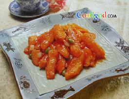 主料比目鱼肉配料青豆、元葱粒调料盐、糖、醋、料酒、番茄酱、淀粉、鸡蛋、花生油、上汤