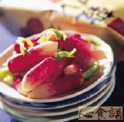 (2)将盐均匀撒在小红萝卜上,静置30分钟后,用手轻轻按压搓揉,使盐份加速渗透入味,让萝卜软化并且质地脆韧,如此连同盐水一起腌浸约1天以上,即可放入容器中加盖冷藏保存,约2~3天即可食用,冷藏约可保存15天以上。