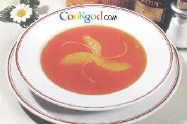 (4)搅打后的汤水回锅,加入橙汁,烧开后加盐、胡椒调味,出菜后在汤上撤上橙肉即可。