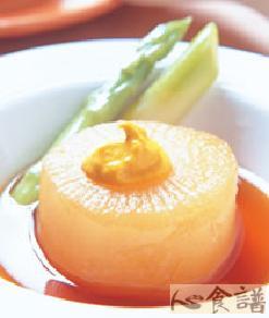 绿芦笋1支,萝卜1条,白米20公克,黄芥末酱适量,煮汁:1/4小匙,水550㏄,鲜美露50㏄,米酒1小匙
