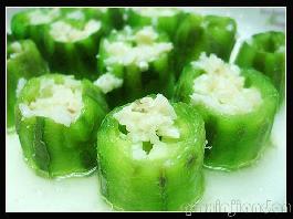 1.将丝瓜去皮切成两三公分一段,淋上捣碎的蒜茸、盐、味精、油调好味道,上锅猛火蒸5分钟就好。