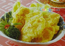 4、红薯片均匀沾裹蛋面糊,放入热油锅中炸至呈金黄色即可。