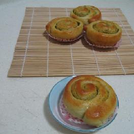 高筋粉120克,酵母2克,温水50克,番薯蓉60克,盐1克,蜜糖10克,糖15克,蛋10克,牛油8克,配料:番薯蓉120克,蜜糖15克,淡奶油30克(拌匀即可),扫面蛋液适量
