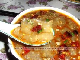 红薯粉是由红薯切片晒干加工从面,既是营养丰富的食品,又是可治疗多种疾病的药膳。好多年没吃过这道菜了,去年冬天倒是看见市场有卖红薯粉的,不过看着不一样没敢买。其实这个菜我以前也只是吃过没自己做过,上次做了一回W不爱吃,自己到觉得很好吃!可是自己又吃不了多少还得想法让他帮忙,所以就想着给里面放点肉,没想到一扫而光了,主要是这道菜入口即化,辣味十足,我觉得看着有点像果冻,爱吃辣的朋友可以试试!不爱吃辣的就不放辣椒。