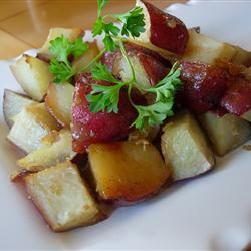 3.在烤箱里烤35分钟或直到红薯变软。途中,翻动一下红薯,以免烤得不均匀。