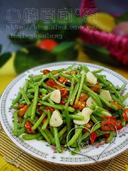 2.加蒜片.红椒圈.豆豉一起炒至断生;
