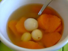 番薯一个,莲心适量、糯米小圆子适量、姜2片,冰糖/红糖/砂糖(个人喜好)