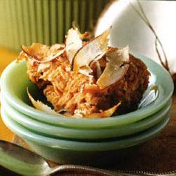 中等大小的番薯2个,去皮,磨碎(或用食物处理机搅打成碎末),无脂奶水(淡奶)1罐(约340克),蔬菜油2汤匙,黄砂糖100克,压紧,浓缩橙汁2汤匙,解冻,姜粉1/2茶匙,丁香粉1/2茶匙,众香籽粉(groundallspice)1/2茶匙,盐1/2茶匙,大鸡蛋1个,略微打散,大鸡蛋白4个,略微打散,椰丝35克