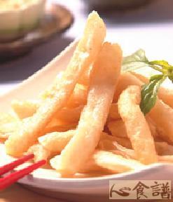 4.地瓜条放入175℃热油中以中火炸约2分钟后,改转小火再炸约7分钟。