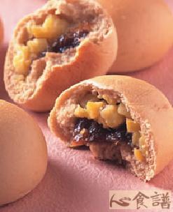 中种面糰:162公克 ,新鲜酵母10公克,高筋面粉270公克,主面糰:68公克 ,水24公克 ,奶粉14公克 ,黑糖41公克,盐3公克 ,全蛋20公克,酵素1公克,奶油68公克,内馅:1又1/2条 ,水1200cc ,细砂糖50公克,黑糖粿加蕉360公克 ,装饰:10颗