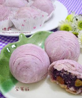 本来是打算做香芋酥的,结果没买到香芋,只好改做紫薯酥了。称量材料的时候我眼花了,水多放了好多,害得我不停的加面粉,都不知道最后加了多少粉和多少水了,结果一称和好的油皮面团居然有600g,这也太多了,只好分出来一半,另外一半加了100g的老面今晚回去做馒头。面团里加了蒸熟的紫薯,所以是淡紫色的哦。接着是油酥的材料:不晓得怎么搞得,称出来的量又有问题,我又只好不停的加猪油加面粉把它和成团,最后一称油酥的面团量是150g。再接着是内陷,因为蒸了两个紫薯一个白薯,都搞不清楚到底是多重,又胡乱加了些熟糯米粉和成团,还加了些葡萄干。总重量是350g。这些量我做了十六个哦。 制作过程网上有很多网友拍的过程图哈,我这个人向来不太喜欢拍,就麻烦大家自己看看文字了: