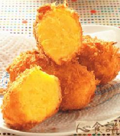 地瓜300公克,姜汁15cc,肉桂1/4小匙,柳橙汁50cc,沙拉油适量,裹粉:适量,鸡蛋1颗,面包粉适量