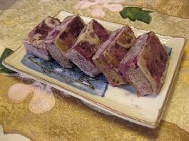 紫山芋3个,白糖2匙,黄油1匙,盐少许,淀粉2勺,水适量,甜红豆馅半杯