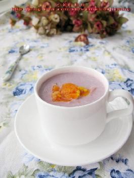 3.紫薯放进搅拌机,加适量水和牛奶,高速打碎成羹。把紫薯羹再放到微波炉热两分钟即可