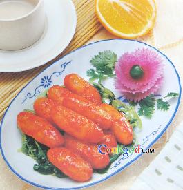4、将湿淀粉、番茄酱、酱油、白糖、醋、盐放入碗内,加适量水调成芡汁,倒入热锅中,待凝倒入薯枣,淋上芝麻油,装入腰盘中间即成。