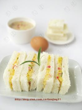 3.将所有材料拌在一起就可以了,然后夹在吐司片里,想要丰盛些的,还可以加点生菜和熟鸡蛋。